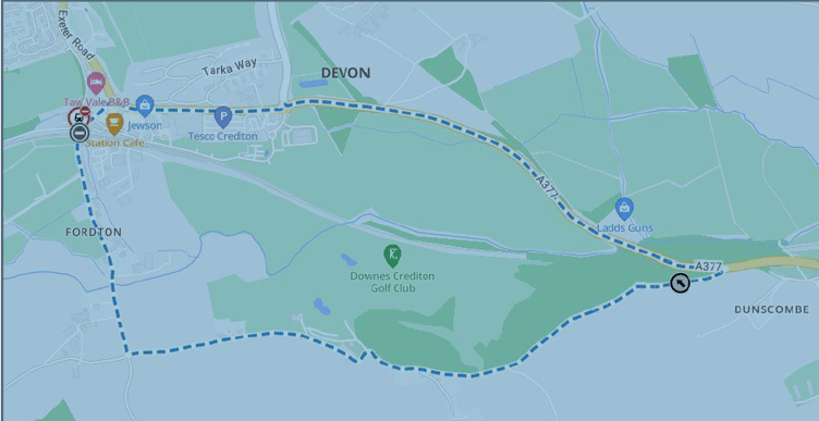 The alternative, signed, route for vehicles will be via the A377 Exeter Road, the road from Fordton Cross to village cross, Station Road and vice versa.
