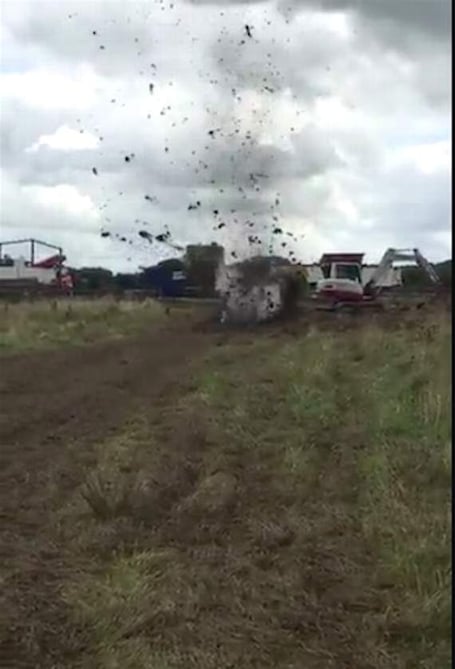 PICTURED is the moment a World War Two hand grenade was blown up by the Royal Navy Bomb Disposal Unit at Winkleigh earlier this week. Officers from Okehampton Police assisted at the scene and this image is courtesy of Okehampton Police.