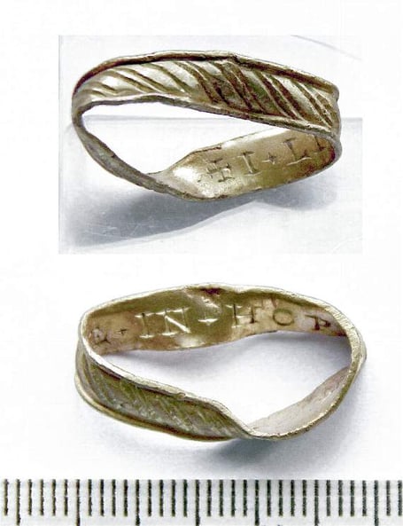 This ring has engraved diagonal lines on the outside which may have once held enamel decoration. It dates from between 1500 to 1700 and is misshapen, perhaps due to plough damage.