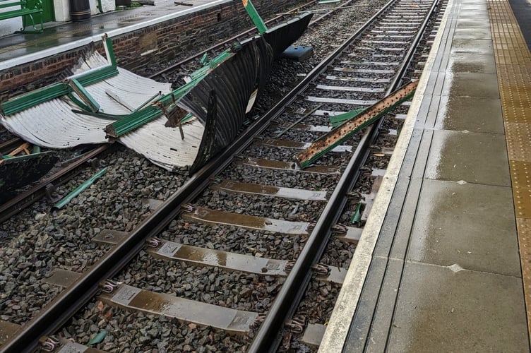 Tuesday and Wednesday saw mass disruption to train services across large areas of England as tracks were flooded and fallen trees blocked routes. The train service from Crediton to Okehampton was cancelled when strong winds stripped Okehampton Station's footbridge of its roof with large sections littering the track.